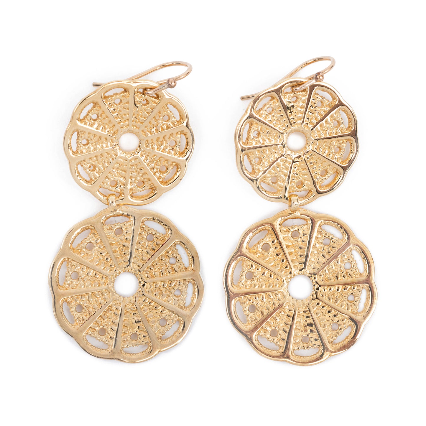 Brighten your day with the glamorous golden glow of these dazzling yet delicate Wild Disk Chandelier earrings. Each intricately detailed disk is plated in 18k gold and coupled to create extraordinary mini chandeliers for each of your ears so you can bring out the elegance in every day. Drawing inspiration from nature, classical adornments, and antique jewels, each piece from local jewellery designer Charlotte Penman is a precious, timeless classic to be treasured for years to come.