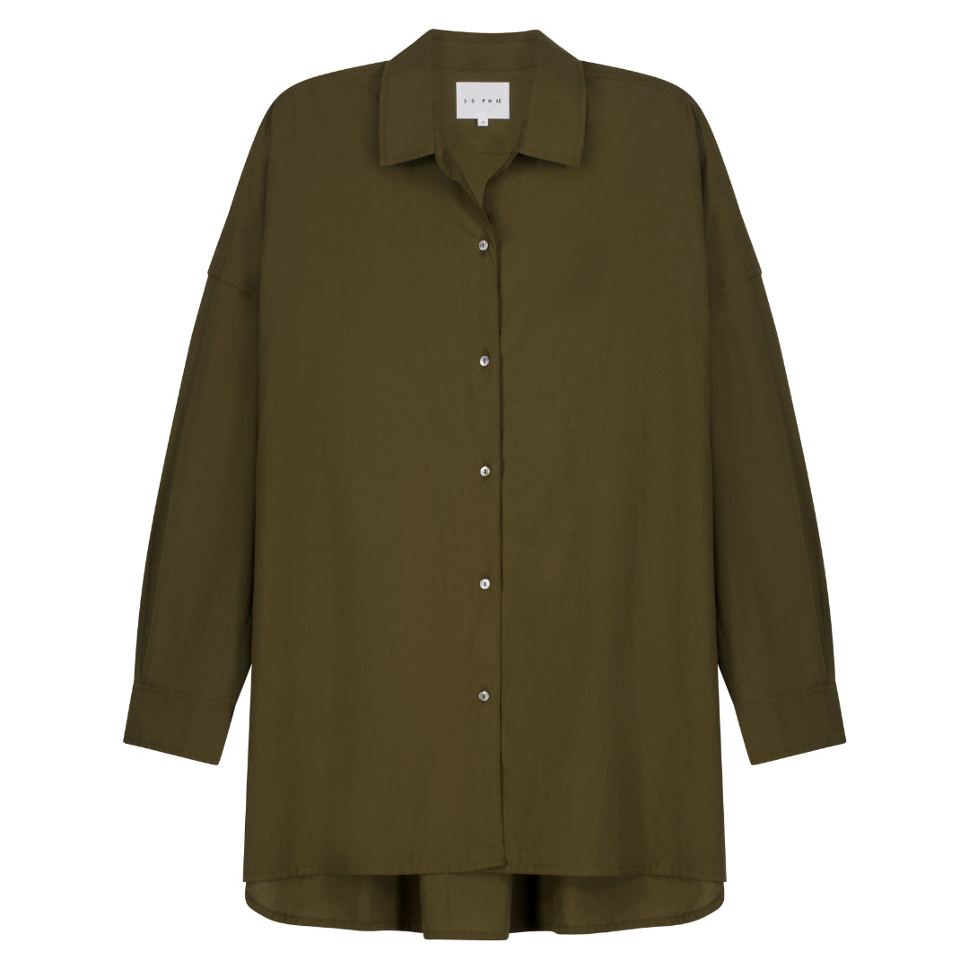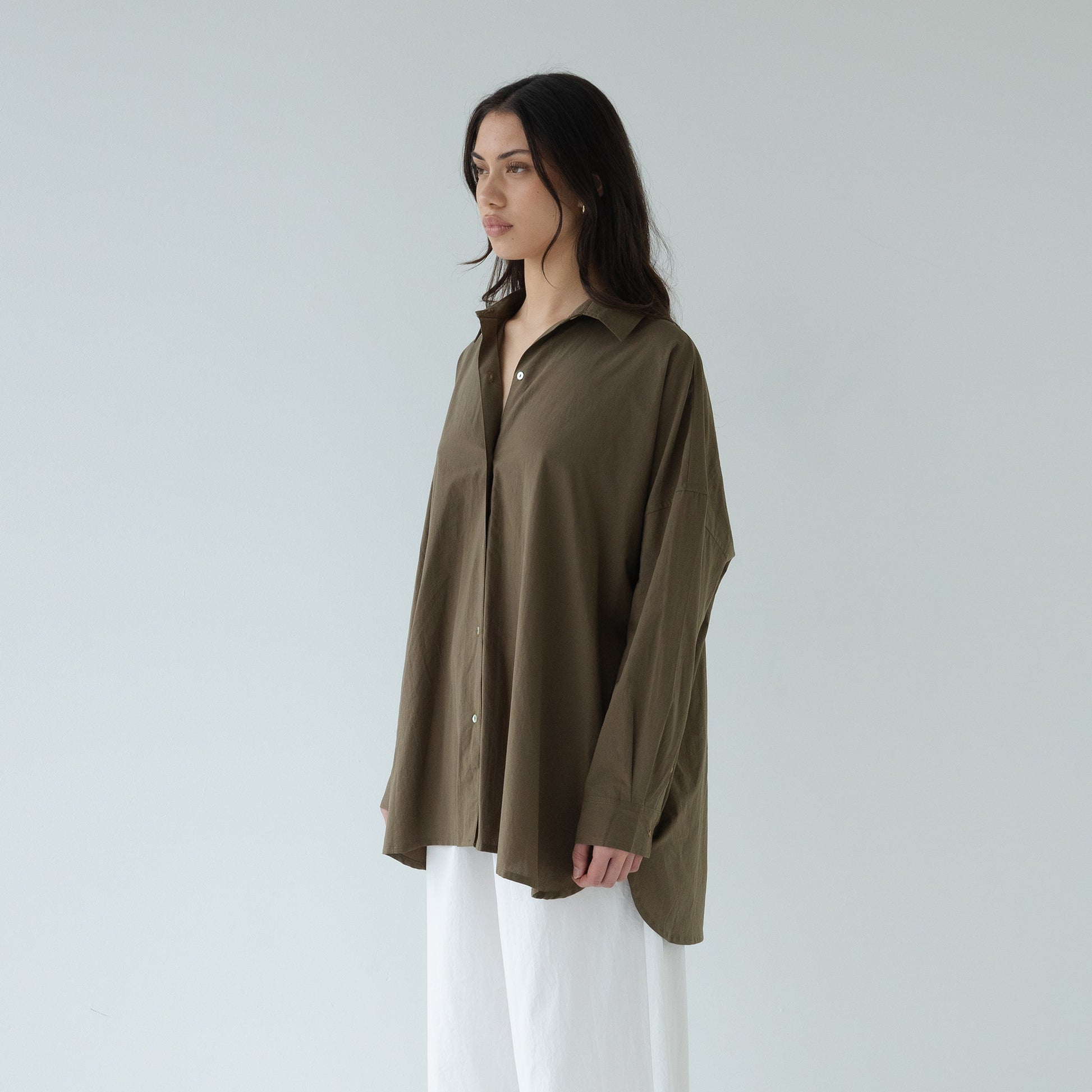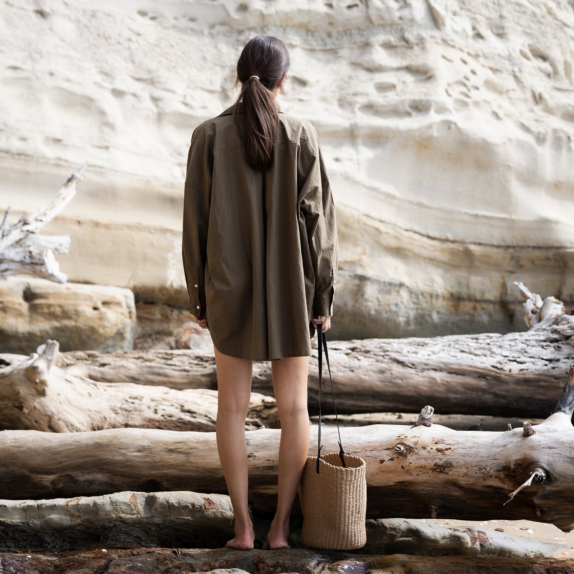 A classic oversized shirt designed to be a throw on and go piece – every day, with skirts, pants and shorts. Featuring a curved hem, shell buttons & an elegant box pleat at the back.